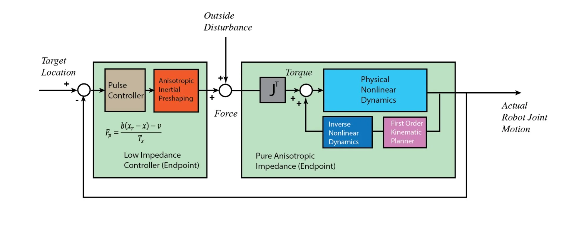 This control architecture features two main components: an inner loop controller that emulates first order dynamics and a pulse controller that initiates movement of the system with appropriate momentum. The inner loop controller takes the current displacement and velocity and computed the appropriate torques to achieve the kinematics of a first order system with specified time constant. The first key insight here is to recognize that the target acceleration and velocity profile are easy to compute if you assume first order dynamics. Stable inner loop dynamics is achieved without worrying about noise of higher order signals. By itself the inner loop would do nothing. The second key insight here is that a driving force, for instance a pulse, can be carefully designed to provide an appropriate starting momentum for the effective inner loop dynamics. The pulse controller at the outer loop computes a discrete duration endpoint force, reshapes the signal according to the variable mass matrix of the robot, then sends the corresponding torques in robot joint space. If all goes according to plan the system will continue to perform smooth ballistic control, and only send pulses in the event of an outside disturbance or modeling error. The behavior as a whole remains extremely low impedance while maintaining high precision in achieving movement goals.